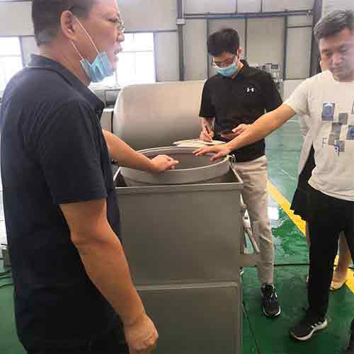 這個(gè)肉全部切割結(jié)束,下一步就是真空腌制,將面糊蛋液進(jìn)行攪拌,當(dāng)然是離不開真空滾揉機(jī)跟變頻打漿機(jī)了