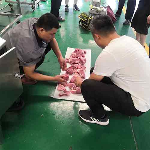 客戶在討論肉條的尺寸、根據(jù)已經(jīng)切割的狀態(tài)進(jìn)行現(xiàn)場(chǎng)探討研究相關(guān)事宜,新鮮的豬肉切割成肉條